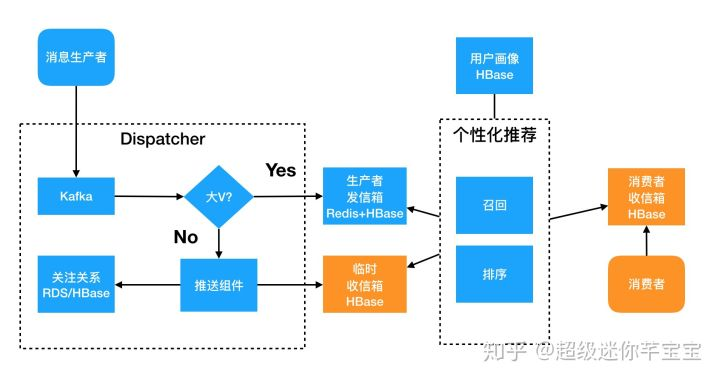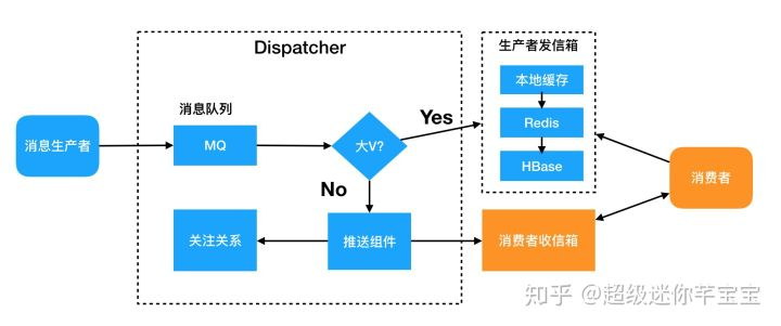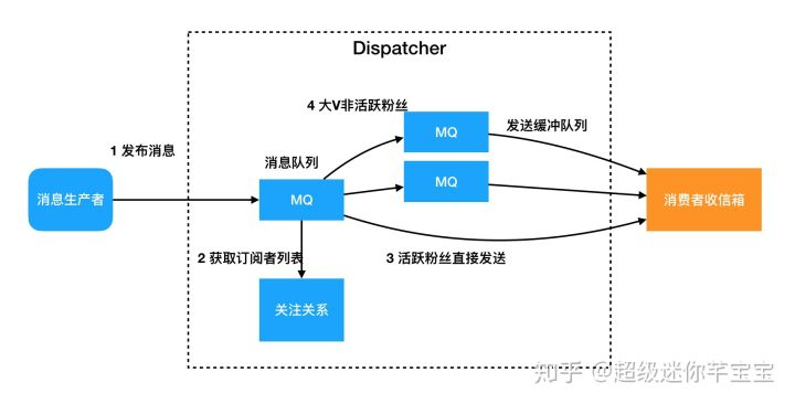 - 异步化。生产者提交消息首先写入一个队列,成功则表示发布成功,Dispatcher模块会异步的处理消息。这一点非常关键,首先生产者的消息发布体验非常好,不需要等待消息同步到粉丝的收信箱,发布延迟低成功率高;其次Dispatcher可以控制队列的处理速度,可以有效的控制大V账号造成的脉冲压力。