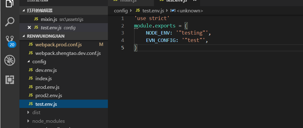 (1)首先,找到打包的核心文件 config/prod.env.js(我们只是为了实现打包时的不同环境的区别,本地测试,也可以这样做),把它复制两份,去你想要执行的命令名(比如 npm run zhengshi,zhengshi 就是他的命令,也可以随便起,只要自己可以区分开),如图: