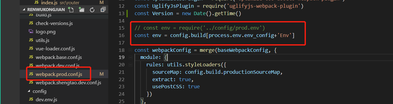 (4)现在重头戏来了,找到build/webpack.prod.conf.js,这个文件是执行打包的核心文件,将原有的const env = require('../config/prod.env'),注释掉,换成const env = config.build[process.env.env_config+'Env'],如图: