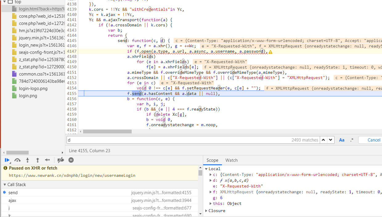 此时的断点位置,一般是一个 XMLHttpRequest 的请求操作。所以我们顺着调用栈往回追。