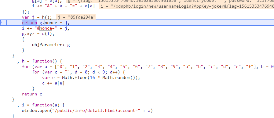 参数 nonce 是从函数 h 返回的。参数 xyz 是从函数 d 返回的!继续往下调试: