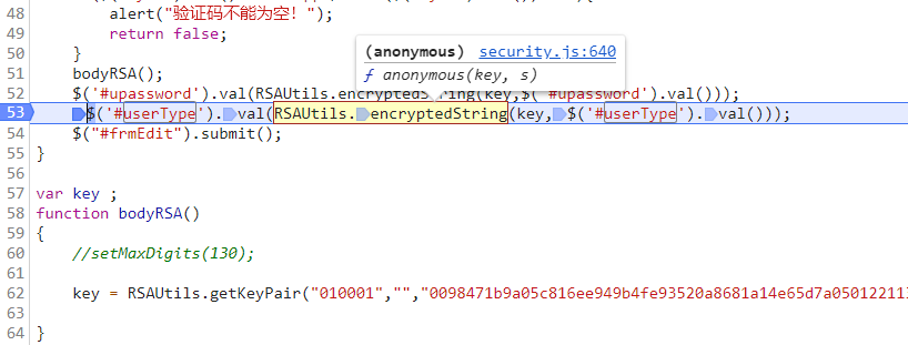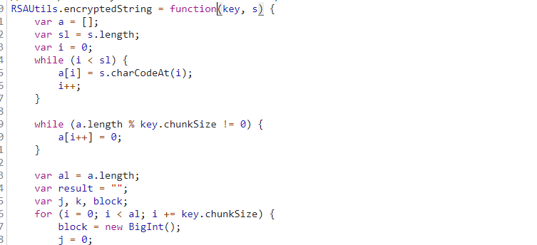 其中 RSAUtils 是一个对象,encryptedString 是该对象中的函数,所以我们先将这个对象的定义找出来。 点击该函数进入,可以发现 RSAUtils 的定义及其相应的函数都在这个 JS 文件中,全部复制下来吧:
