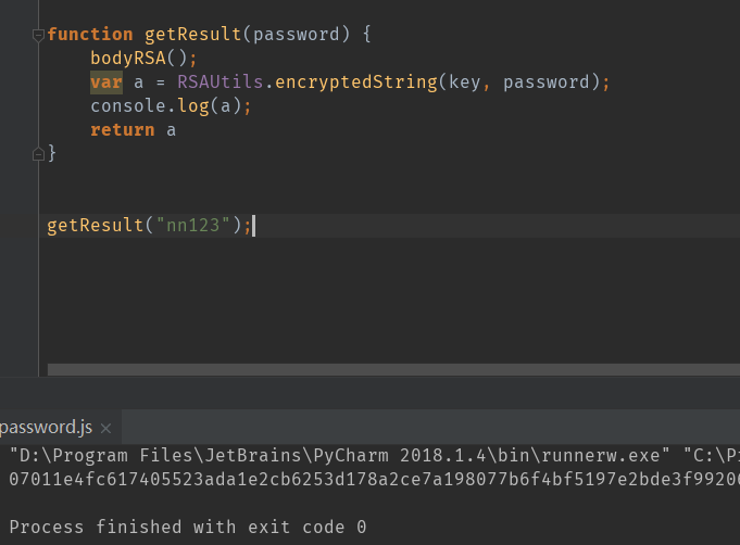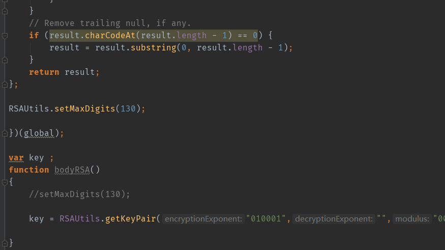 注意在将 userName 和 password 加密之前执行了 bodyRSA() 函数,所以也将相应的 JS 代码复制下来 最终 JS 文件内容如下: