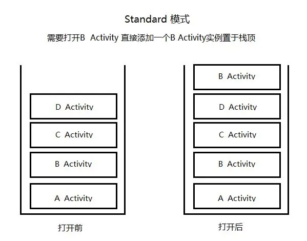 Standard(标准模式)是Activity的默认启动模式,创建实例的时候,不管之前是否已经有此Activity的实例,都会创建一个新的Activity实例置于栈顶