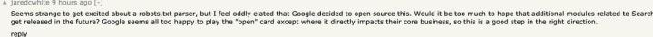 还有网友对谷歌愿意开源 robots.txt 解析器感到既兴奋又惊奇,谷歌将来还会开源与搜索相关的其他模块吗?想想都有点刺激呀。