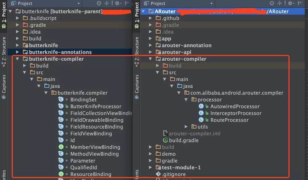 说到编译时注解,就不得不说注解处理器*** AbstractProcessor***,如果你有注意,一般第三方注解相关的类库,如bufferKnike、ARouter,都有一个Compiler命名的Module,如下图X2.3,这里面一般都是注解处理器,用于编译时处理对应的注解。
