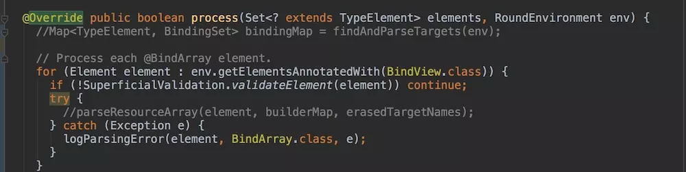 for (Element e : env.getElementsAnnotatedWith(BindView.class)) {