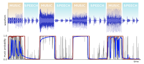 下图是一段混合着语音和音乐的音频的分类结果,红色的曲线是一个简单的基于GRU模型的预测结果,蓝色的是一种传统的基于HMM算法的预测结果。