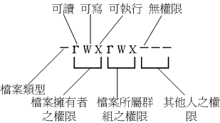 第一组是文件拥有者对该文件的操作权限,第二组是文件所属组对该文件的操作权限,第三组是其他组的用户对该文件的操作权限。举例说明:有一个文件的权限数据为『rwxr-xr--』,那么前3个字符表示文件的拥有者可以对文件进行读、写、执行三个操作,中间3个字符表示该文件的所属组可以对文件进行读和执行操作,最后3个字符表示其他群组的用户只能对该文件进行读操作。