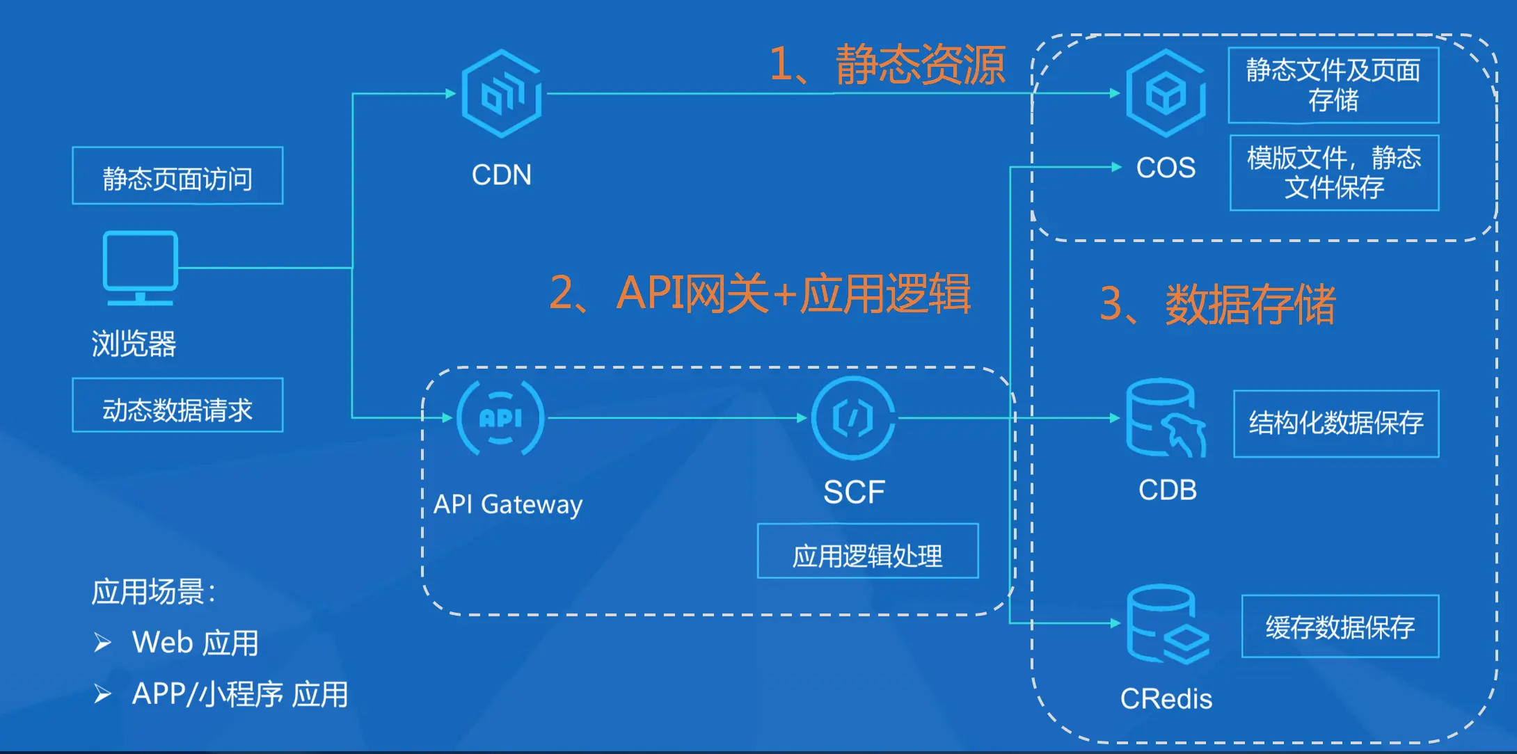 静态资源(JS/CSS/IMG/HTML)放在COS(对象存储),COS可以自定义域名和开启CDN加速(具体请查看腾讯云文档《配置自定义域名支持 HTTPS 访问》),通过URL直接访问,这和原来的Web Application没有什么区别。