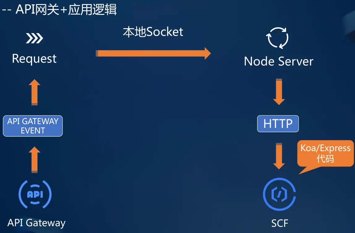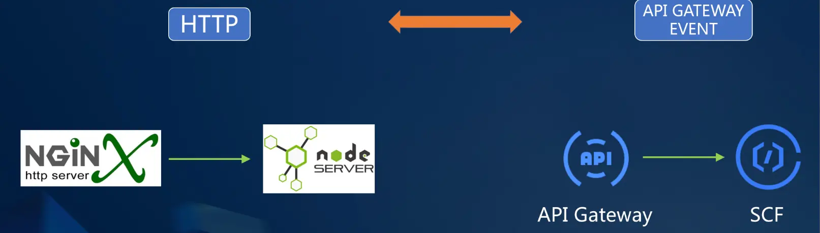 我们可以将API网关事件转换成http请求,通过本地socket和函数起nodeserver进行通信。