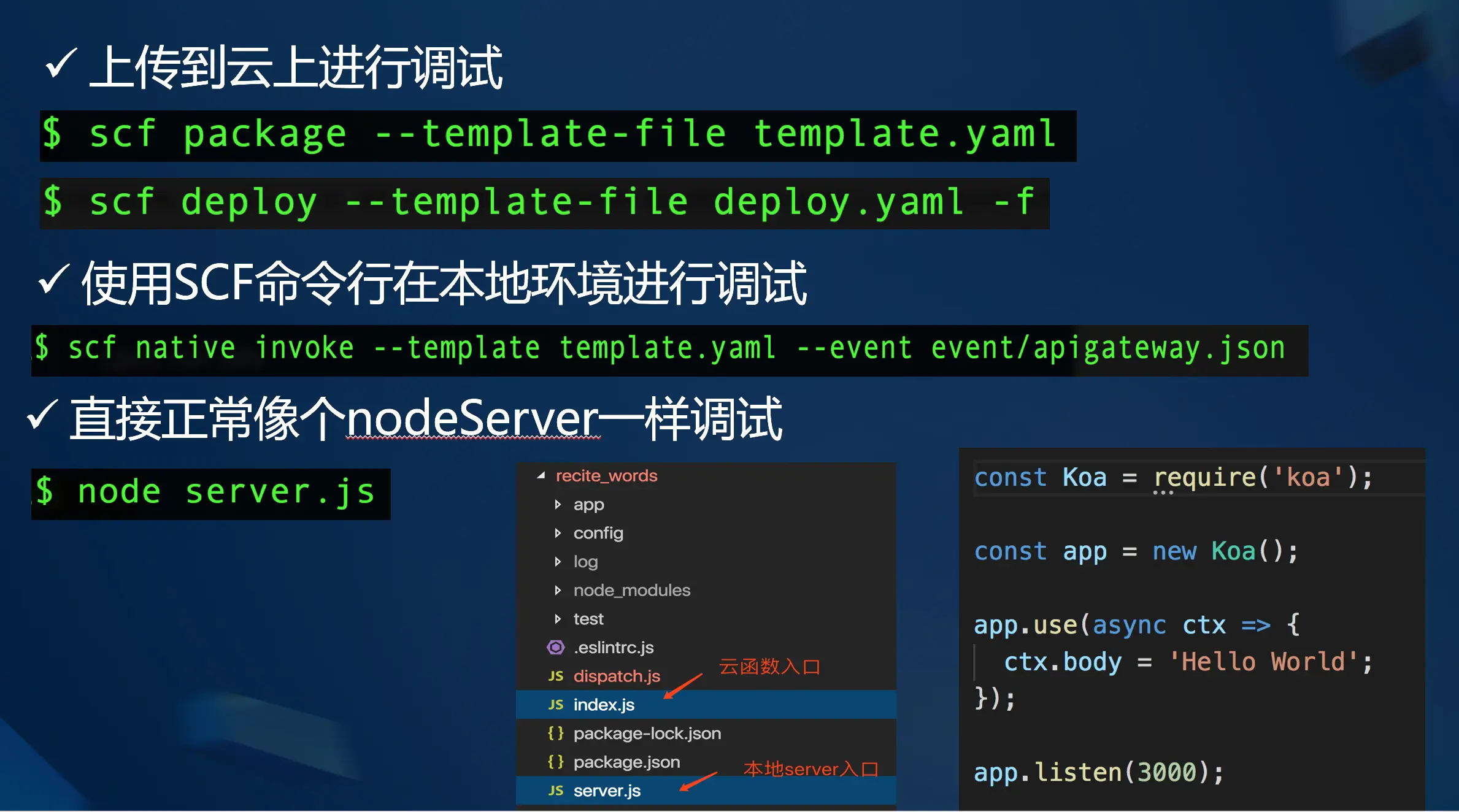 随着开发者的反馈,云函数的同事又推出了TCF升级版本。可以支持native调试,其实就是用本地的环境进行调试。这样至少连接数据库没有连通问题,以及调试的时候没有操作系统差异问题。那么最后一个问题只能是需要一个专门的编译机了。一般情况下,如果依赖的npm库如果不涉及到操作系统差异的话,npm包都是可以通用的。