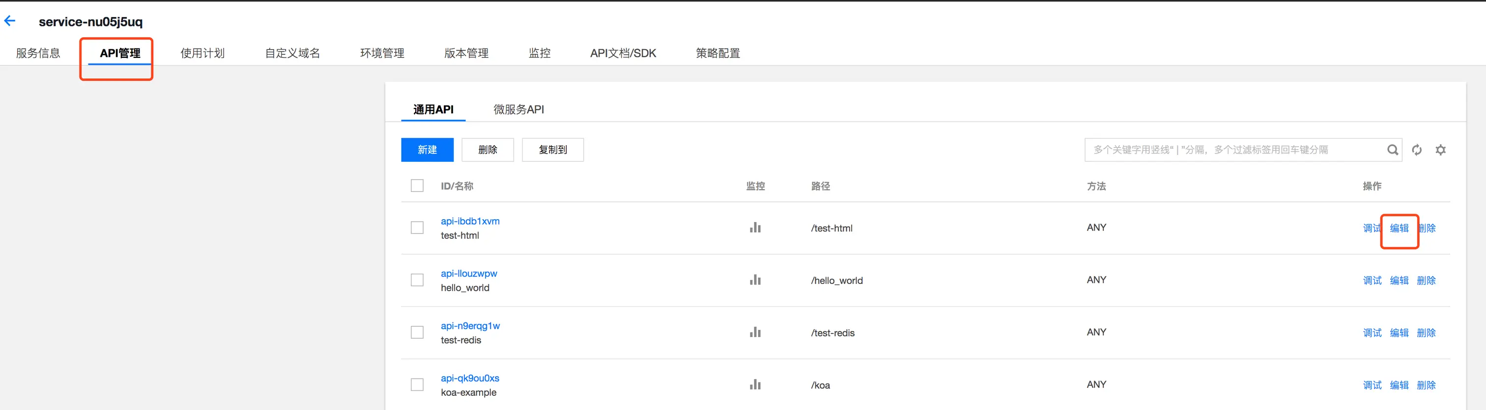 具体操作路径:点击API网关具体的服务进到详情页,在API管理下,针对每个API进行编辑。
