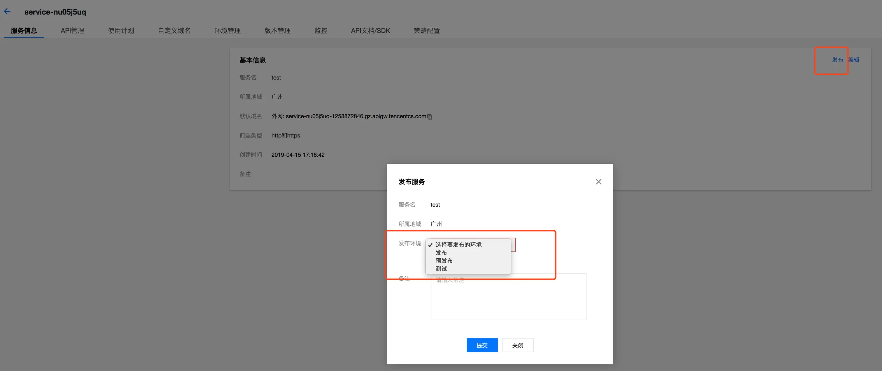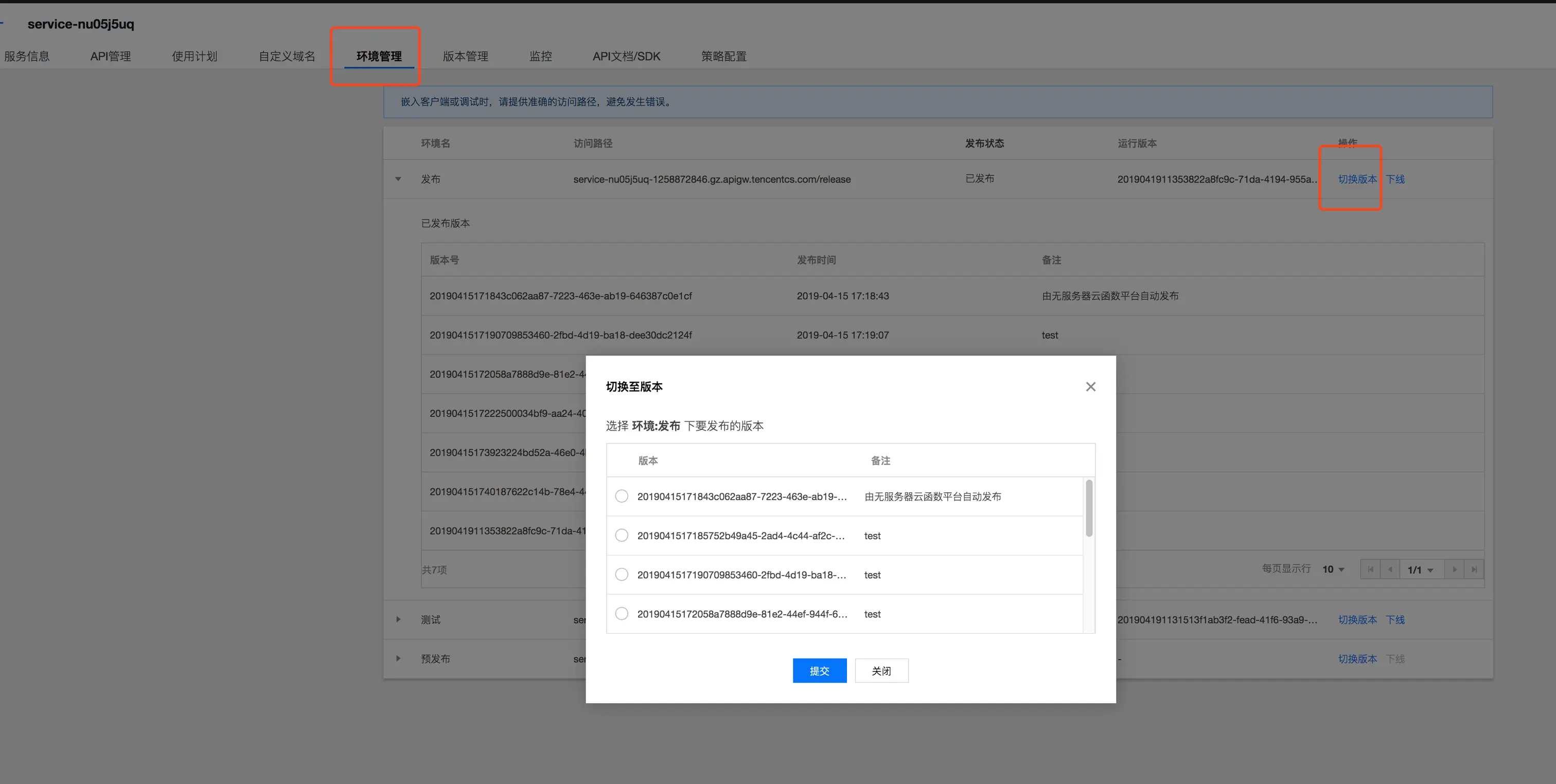 API网关也默认有测试、预发布、发布3个环境,可以指定云函数的版本。