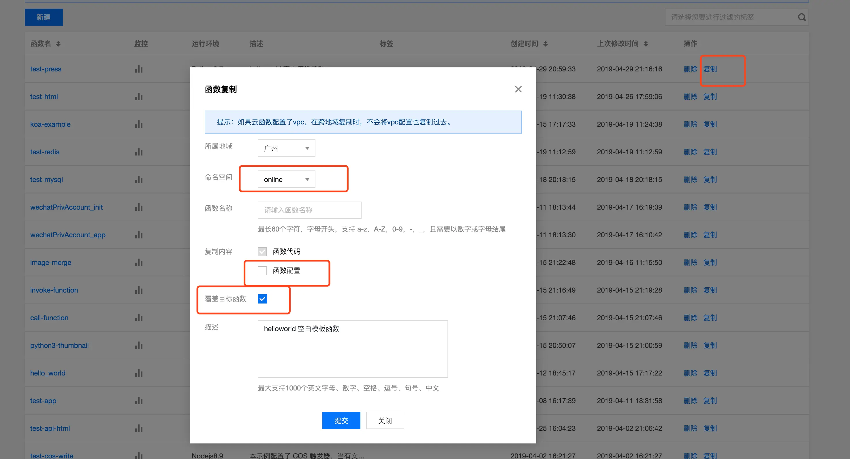 那么我们可以利用命名空间来将测试和发布环境隔离,发布可以通过函数复制来完成,可选不复制配置,配置在线上和测试环境设置不一样,代码通过判断环境变量来连接线上和测试的资源。