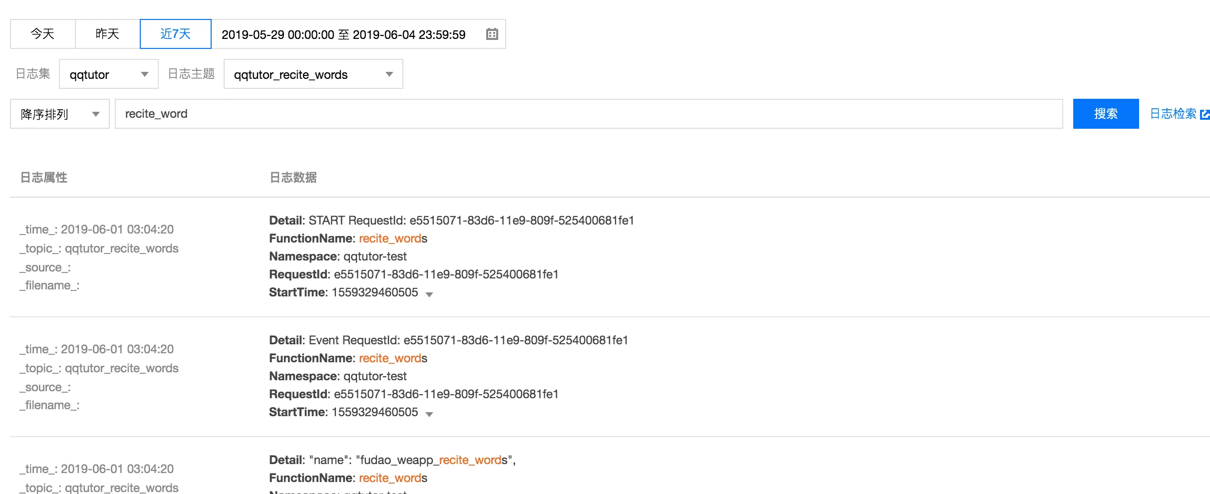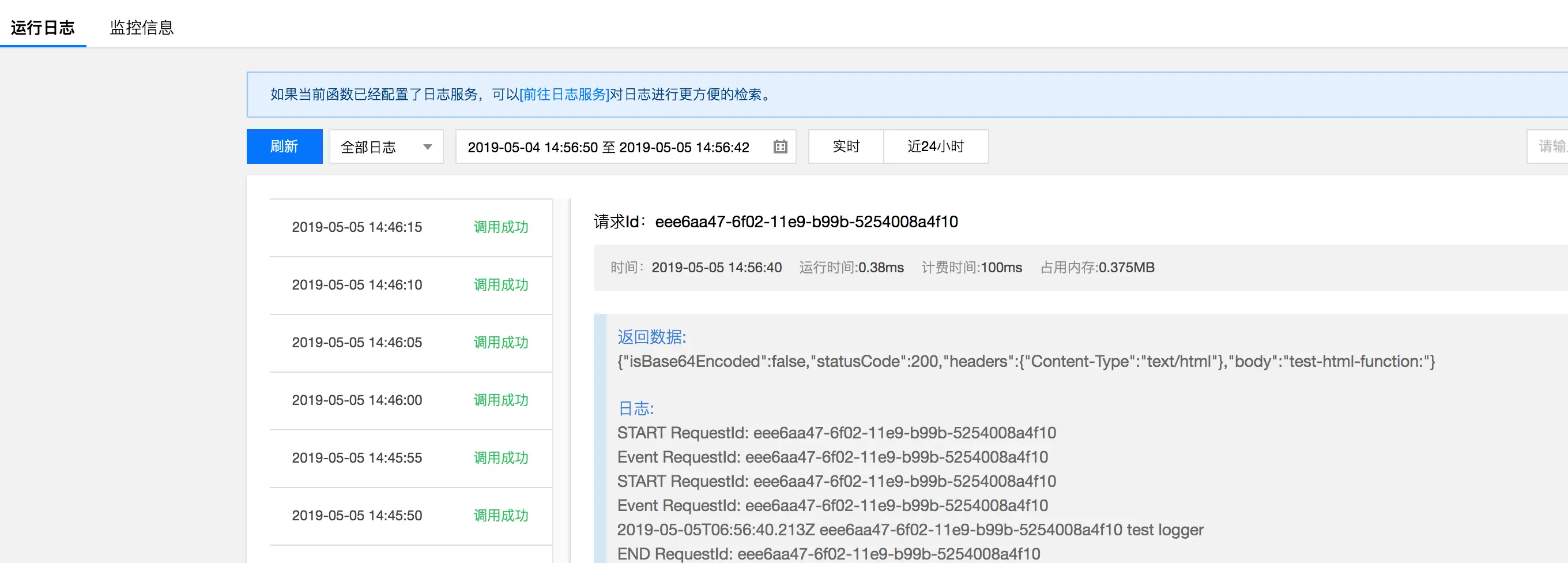 如果当前函数已经配置了日志服务,可以[前往日志服务]对日志进行更方便的检索。