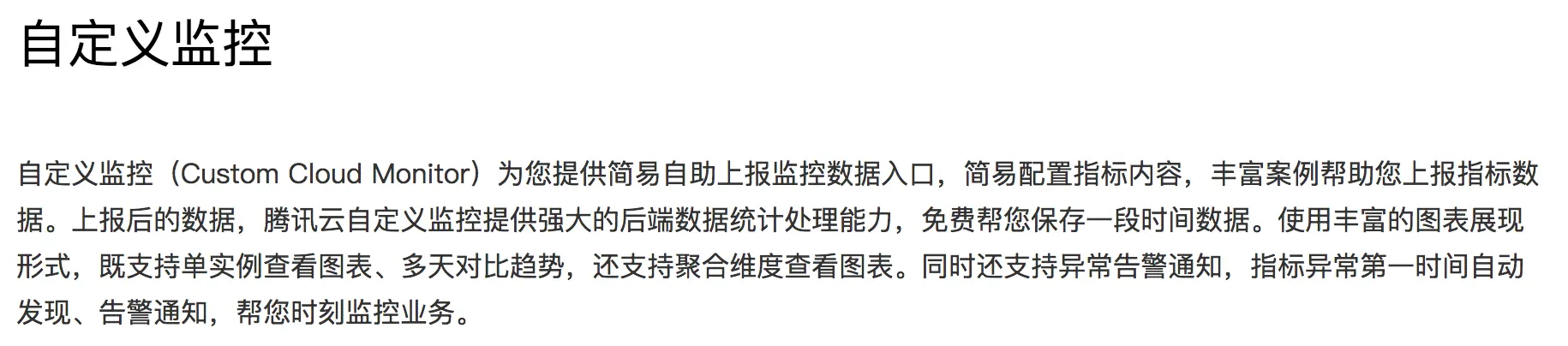 其中自定义监控对后台服务来说也是非常需要的,可以上报一些业务类型的指标或者告警。可查看文档:自定义监控