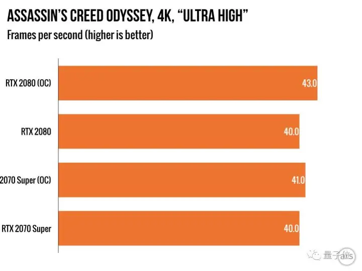从性能指标上来看2070 Super已经接近于它的大哥2080。根据外媒ArsTechnica的测试,超频版的2070 Super在游戏《刺客信条:奥德赛》中的帧数超过了2080。