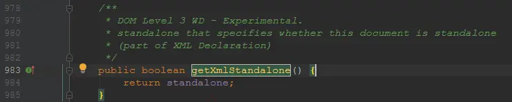 }我们在 CoreDocumentImpl 类中第983行发现了getXmlStandalone方法。