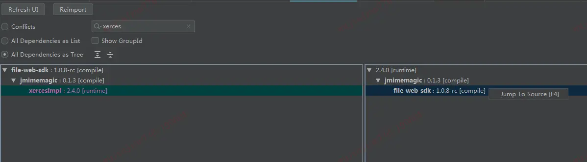 清晰明了,原来这个罪魁祸首是被 file-web-sdk 带进来的,我们右键选择 Jump To Source或者 F4 定位到这个 jar 在 pom.xml 的依赖引入位置,如下图所示,我们通过 exclusion 标签排除 xercesImpl 的引入即可。