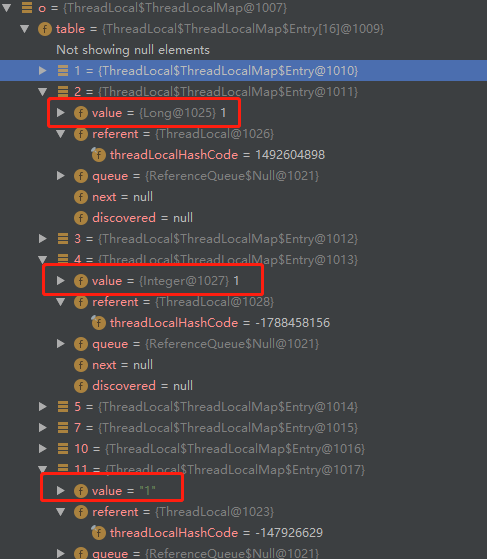 实际上,主线程的threadLocals属性中的哈希表中一般不止我们上面定义的三个ThreadLocal,因为加载主线程的时候还有可能在其他地方使用到ThreadLocal,笔者某次Debug的结果如下: