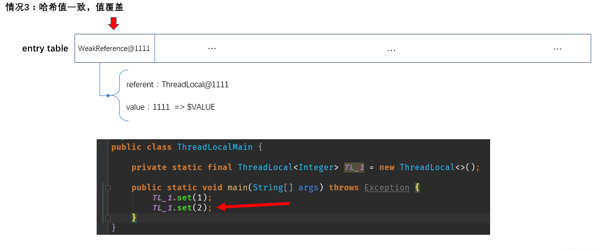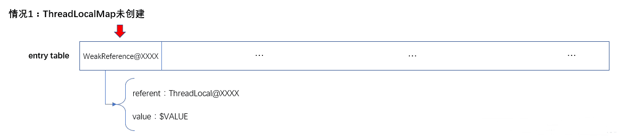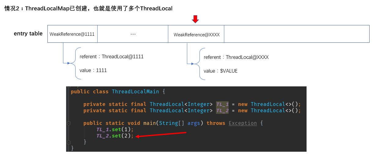 这种情况下,TL_1这个ThreadLocal在主动GC之后,线程绑定的ThreadLocal.ThreadLocalMap实例中的Entry哈希表中原来的TL_1所在的哈希槽Entry的引用持有值referent(继承自WeakReference)会变成null,但是Entry中的value是强引用,还存放着TL_1这个ThreadLocal未回收之前的值。这些被”孤立”的哈希槽Entry就是前面说到的要惰性删除的哈希槽。