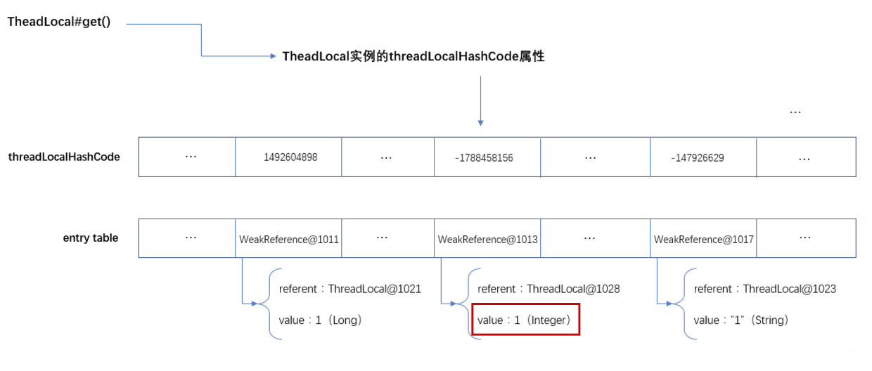 上图threadLocalHashCode属性一行的表是为了标出每个Entry的哈希槽的哈希值,实际上,threadLocalHashCode是ThreadLocal@XXXX中的一个属性,这是很显然的,本来threadLocalHashCode就是ThreadLocal的一个成员变量。