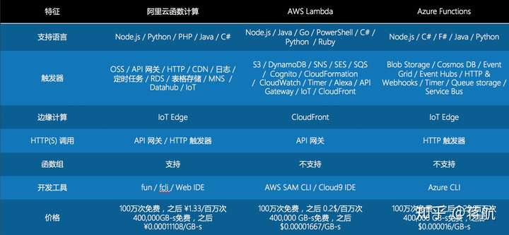 上图从支持语言、触发器、价格等多个方面对不同 Serverless 服务进行了对比,可以发现有差异,也有共性。