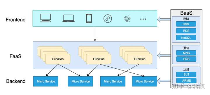 BaaS(Backend as a Service)则是一些后端云服务,比如云数据库、对象存储、消息队列等。利用 BaaS,可以极大简化我们的应用开发难度。