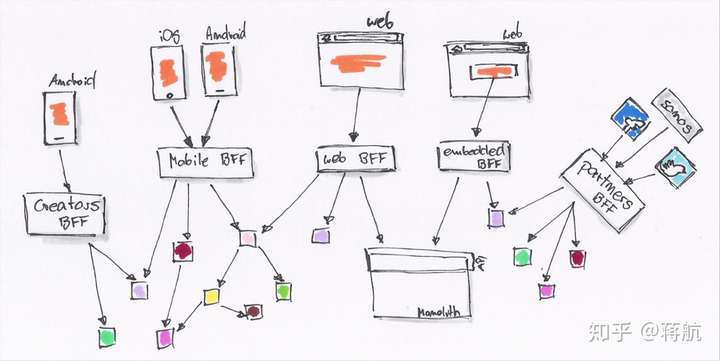 最底层的就是各种后端微服务,最上层就是各种前端应用。在微服务和应用之前,就是通常由前端工程师开发的 BFF。