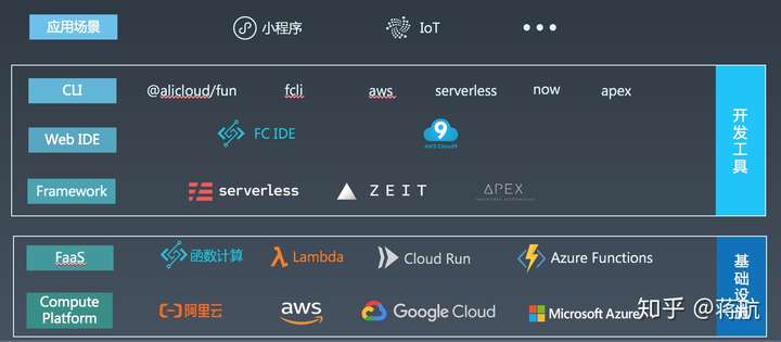 在开发工具上面一层,则是 Serverless 的一些垂直应用场景。除了使用传统的服务端开发,目前使用 Serverless 技术的还有小程序开发,未来可能还会设计物联网领域(IoT)。