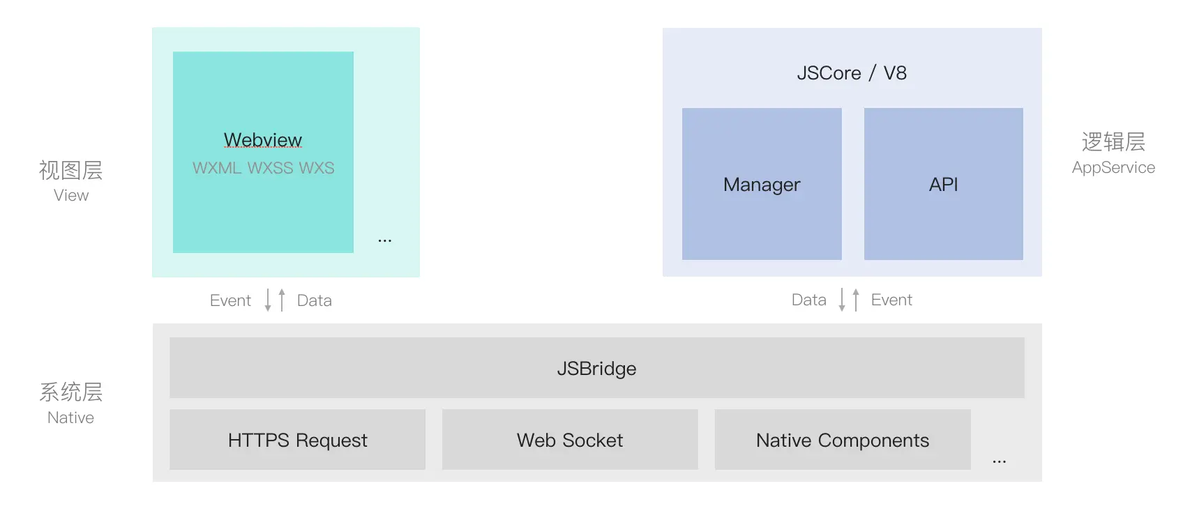 小程序整体框架分为三个层,视图层、逻辑层和系统层。视图层包含了小程序各个页面的WXML、WXS和WXSS。逻辑层则运行在JavaScript执行引擎中,包含处理数据逻辑和封装客户端提供的API。 系统层则提供微信客户端原生的能力。除了微信原生功能支持、网络请求等,还提供视图层和逻辑层之间数据传输与事件通知的功能。