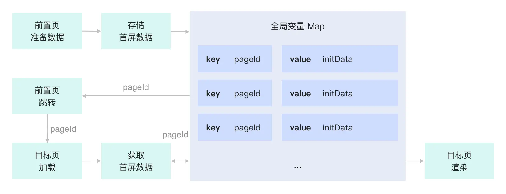 前置页准备目标页首屏渲染的数据,存储到全局变量Map中,同时生成目标页的pageId;