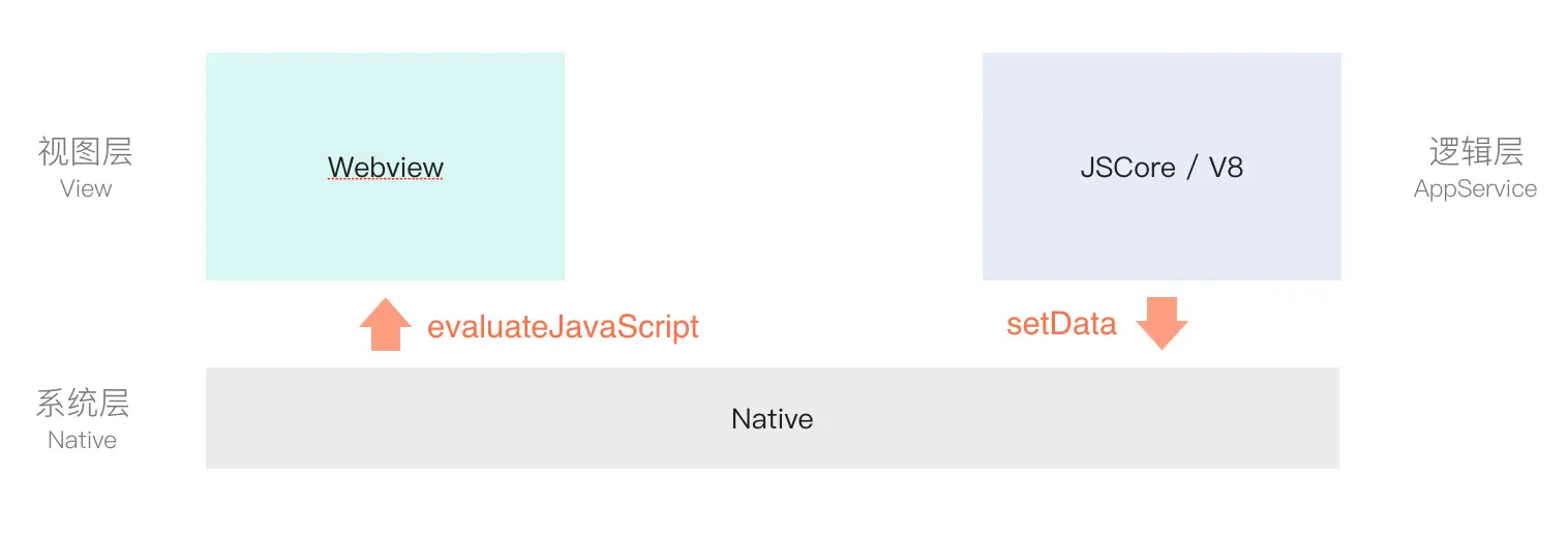 视图与逻辑属于不同线程,无法直接通信,数据传输主要通过系统层进行。逻辑层调用setData将数据变化通知给视图层,经过系统层触发页面更新。