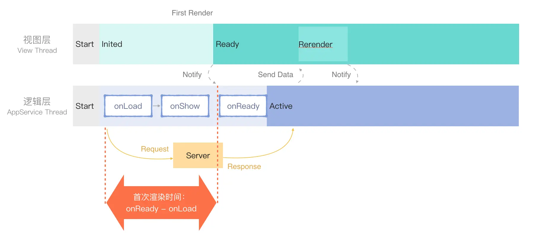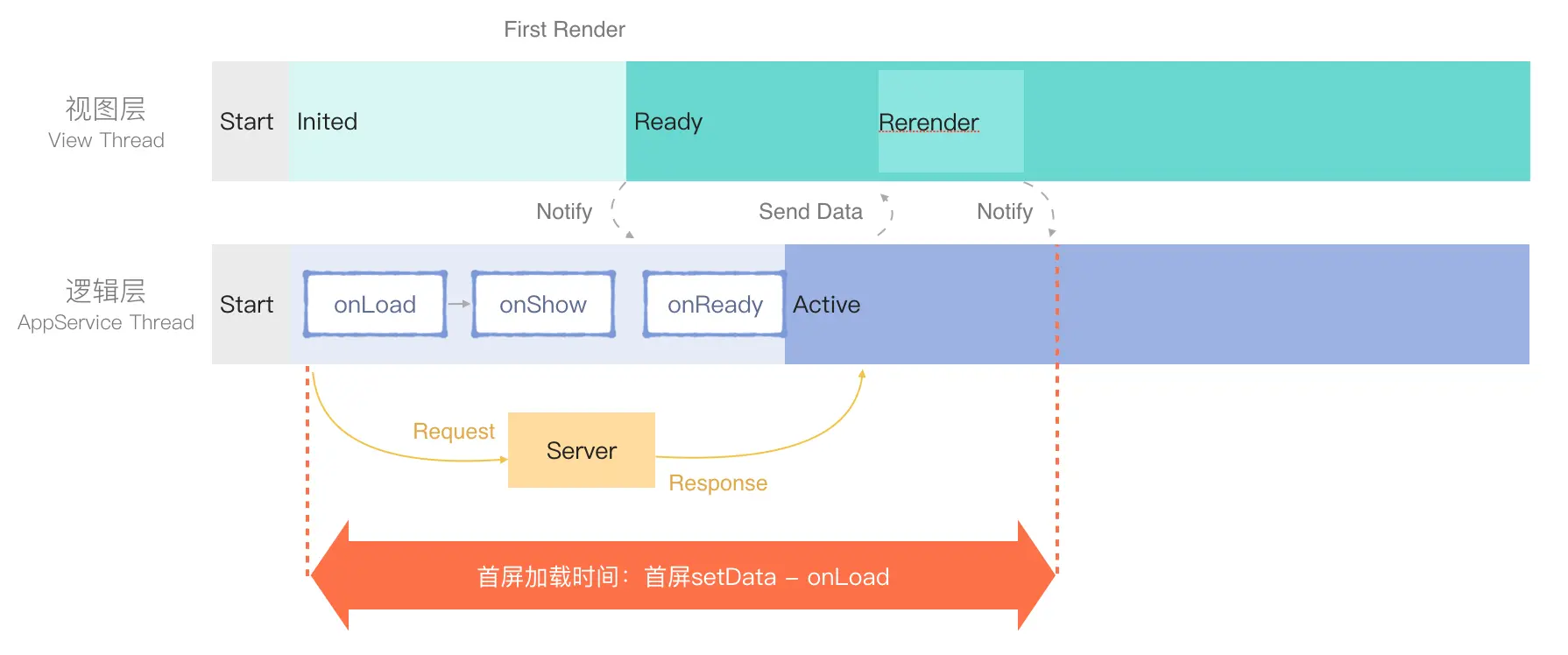 视图层初始化,同时逻辑层页面实例创建后,触发onLoad和onShow事件,等待视图层初始化完成后的通知,再发送页面的初始数据;