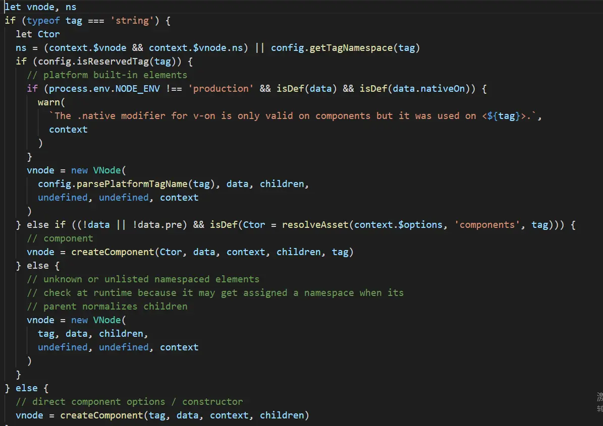 这里先对 tag 做判断,如果是 string 类型,则接着判断如果是内置的一些节点,则直接创建一个普通 VNode,如果是为已注册的组件名,则通过 createComponent 创建一个组件类型的 VNode,否则创建一个未知的标签的 VNode。 如果是 tag 一个 Component 类型,则直接调用 createComponent 创建一个组件类型的 VNode 节点。