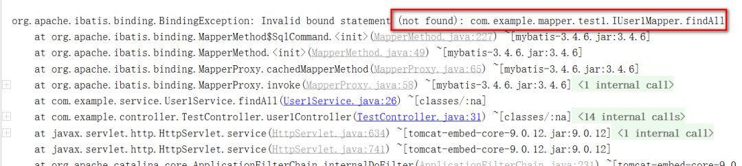 这个时候我们整个的驼峰命名就算处理好了。另外不配置这个还有另外一个问题出现,就是如果你的sql是写在xml文件中的,那么你的接口和xml文件是不对应的,就会报错,我们来看一下会报什么错。