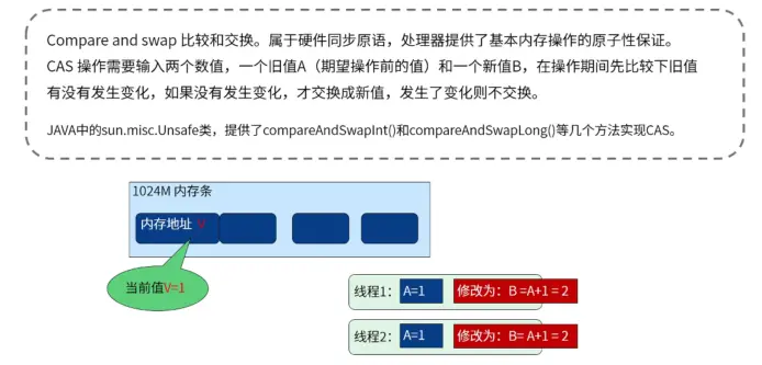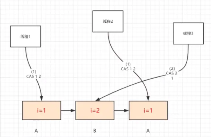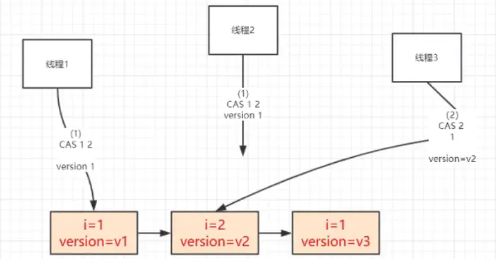 - 线程1 和 线程2 同时发起了对于变量 i 的 CAS请求。正确情况下,应该某一线程会失败(这里假设 线程2 会失败)