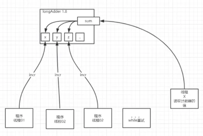 - 每一个线程都有一个独享的累加器,在需要求和的时候,再取出来相加。避免了重试(Atomic)或者竞争(sync)。