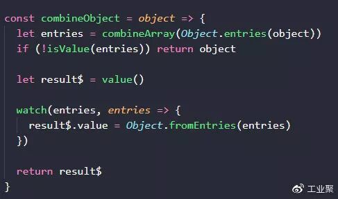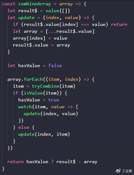 实现 combineArray:如果一个数组里存在一个 reactive value,那么它也返回一个 reactive array,每次输出一个纯数组。如果数组里不包含 reactive value,它什么也不包装,直接返回该数组。相当于 Promise.all(list),只不过它有可能不返回 promise/reactive-value。