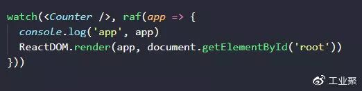 前面我们将 jsx 编译从 React.createElement 切换到我们的 createElement 函数,因此 <Counter /> 组件不是返回 react-element,而是返回我们的 reactive-value,它是一个响应式的值,可以被 watch。我们 watch 这个 <Counter />,然后拿到它真正的 react-element,再用 ReactDOM 渲染到 root 节点。