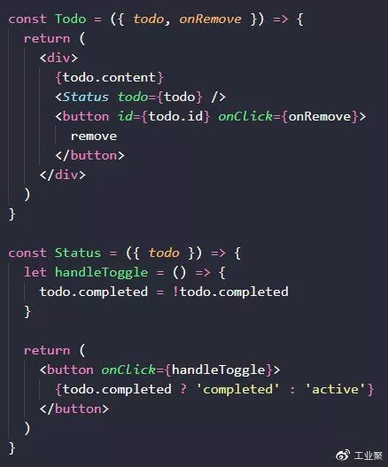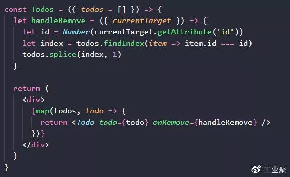 它通过 map 函数,将 reactive todos 映射成 Todo 组件,每当 todos 变化时,这个 map 函数就会自动再次执行,然后 top-level 的 app 就会拿到一个 immutable vdom,除了 todos 以外,其它结构复用原来的引用。