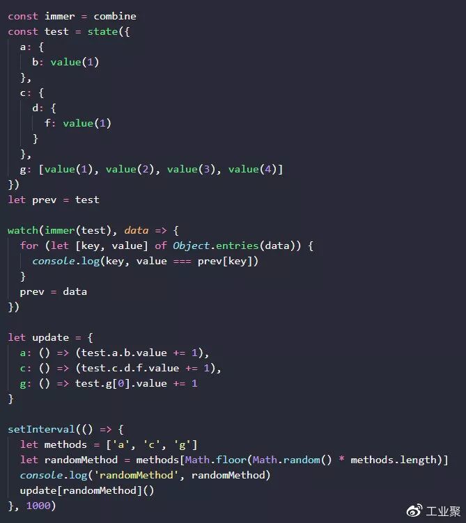 我们 reactive-state 的版本则是,draftState 不必限制在 update 函数里,可以在外面随意传递和使用,watch 函数拿到的总是 immutable 的。