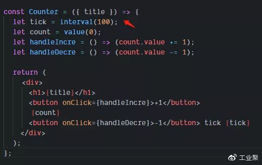 因为 let count = value(0),它是一个 reactive-value。它被 handleIncre 和 handleDecre 修改,它同时用在了 jsx 里。我们的 createElement 会检测到这个 jsx 结构里包含一个 reactive-value,因此它会被整个 combine 起来,成为一个大的响应式的值 view.value。