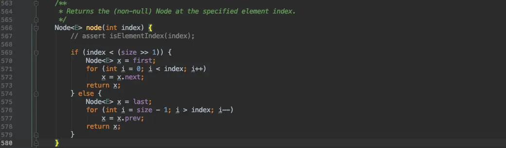 LinkedList 由于底层不是数组,不支持通过下标访问,而是需要根据查询 index 所在的位置来判断是从头还是从尾进行遍历。