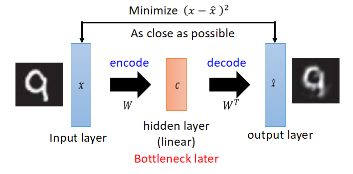 PCA的解释:原向量x乘以矩阵W得到中间编码c,再乘以W的转置,得到x head,得到的x head希望与原x越接近越好,有一点要注意,从x到c的变换过程是线性的。