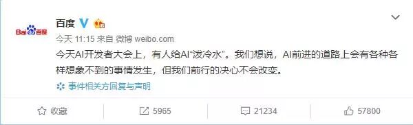 会后百度官方微博对此进行了回应:有人给AI“泼冷水”,AI前进的道路上会有各种想象不到的事情发生,但我们前行的决心不会改变。