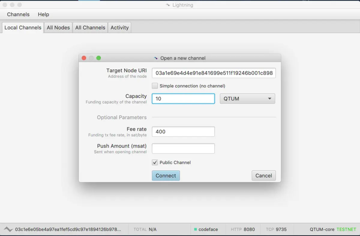 在弹出的页面中,填入通道对方的URI,和通道的容量,这里设为了10个 QTUM。点击 “Connect”,创建通道,这时还需要等到6个区块,让交易得到确认,通道才真正创建成功。