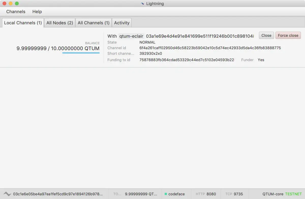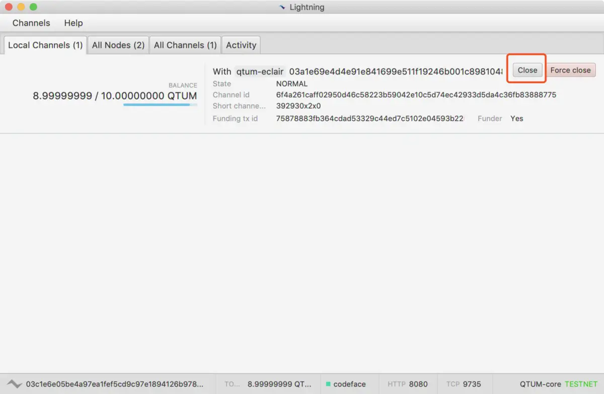 关闭后,通道内的 QTUM 余额就会返回各自的 Qtum Core 钱包内。
