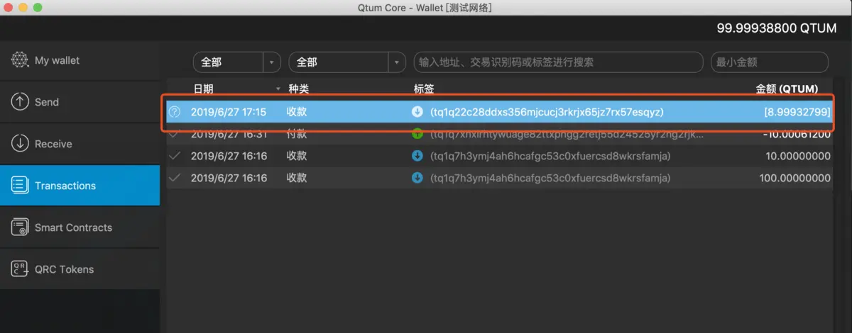 运行 Qtum Core 钱包,等待区块同步完毕,并发送一定数量的测试币到此钱包中。